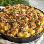 Cowboy casserole with crispy tater tots, creamy beef filling, crispy bacon, and melted cheese — hearty, salty, and ridiculously satisfying.